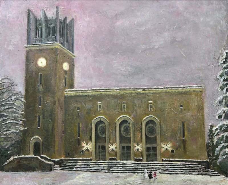 今回ご紹介いたします新宿教室会員様の作品は雪景色の早稲田大学・大熊講堂を描きました薄木会員様の油絵です。