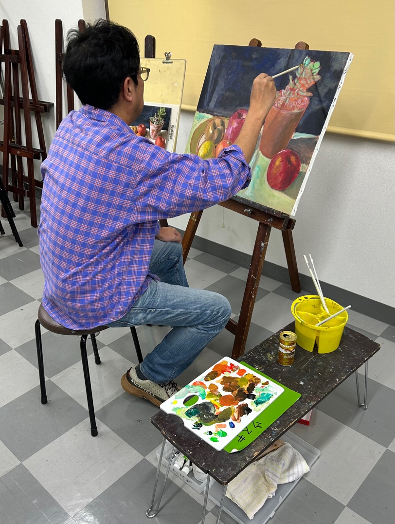 今年の楽々展には自画像の大作を出品され、現在はアクリル画での技法を研究中です。